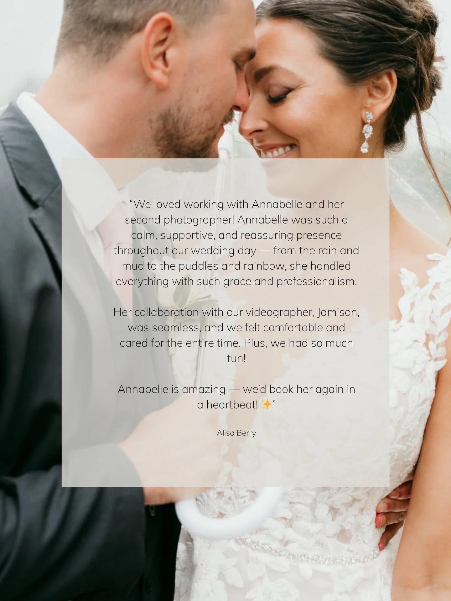 "I cannot recommend Annabelle enough! From the very beginning of the booking process she was amazing. She was prompt in her responses, very personable, genuine and passionate about making our expeirience a good one. On the wedding day she was so on top of everything, she made sure the timeline was flawless so that the day felt natural and not rushed, she made sure to take into consideration the shots that we wanted… she was so great at directing us and making us feel natural in our photos. She was very easy going and professional, she was very helpful and on top of things, not to mention, the absolute sweetest! When we got our pictures back we were blown away!"